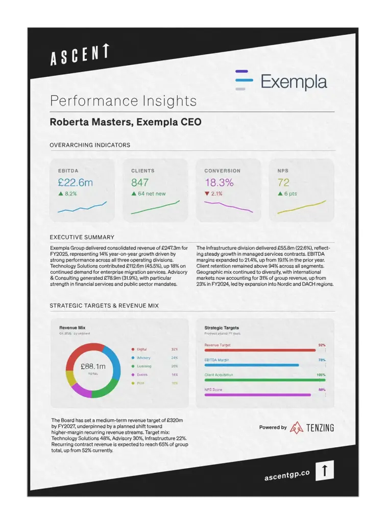 Tenzing brings the skills, discipline, and capability expected of a leading European investment firm. This includes deep experience in benchmarking performance, identifying value creation levers, applying operational rigor, driving sustained growth and maximising the outcome of any value event. Ascent leverages all of these capabilities to deliver as much value as possible to each of its members in their pursuit of growth.